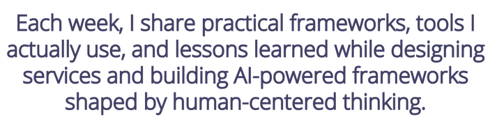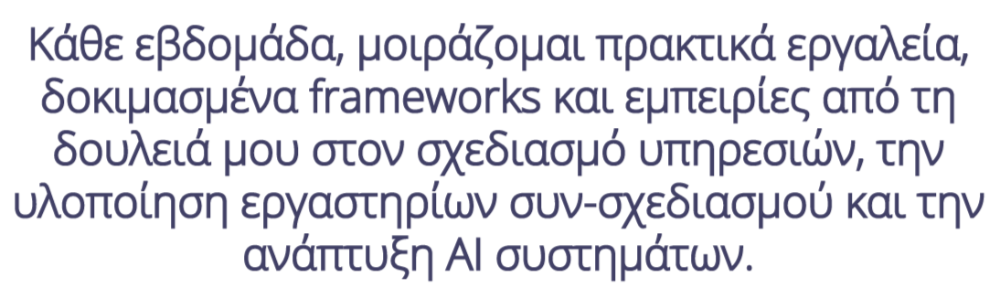 Χαίρομαι που είσαι εδώ! Από εδώ και πέρα θα λαμβάνεις σύντομα, πρακτικά tips, εμπειρίες μου και εργαλεία για να βελτιώσεις τον τρόπο που σχεδιάζεις, δημιουργείς και παράγεις περιεχόμενο, είτε μέσω της μεθοδολογίας του Design Thinking, είτε μέσω της Τεχνητής Νοημοσύνης.